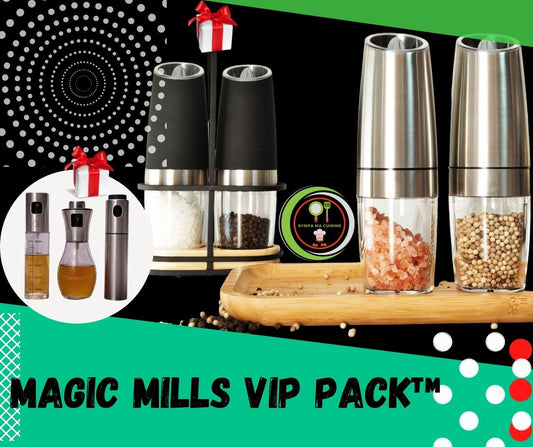 Magic mills vip pack™️ Set de deux moulins de cuisine électriques, adaptés pour moudre et saupoudrer sel, poivre et épices en tous genres.
